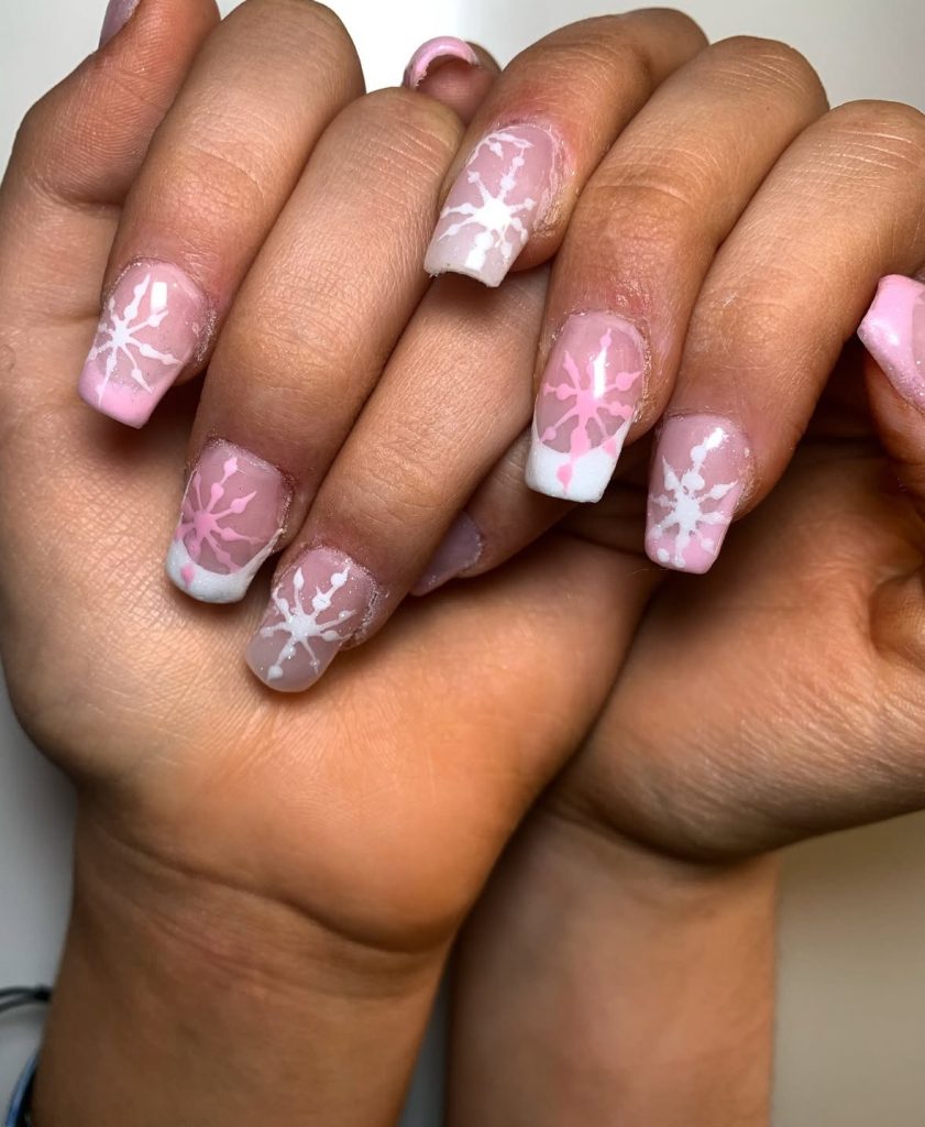 Soft pink squares with frosty tips and oversized flakes drifting across each nail. Kinda like bubblegum meeting a blizzard (in the cutest way possible).