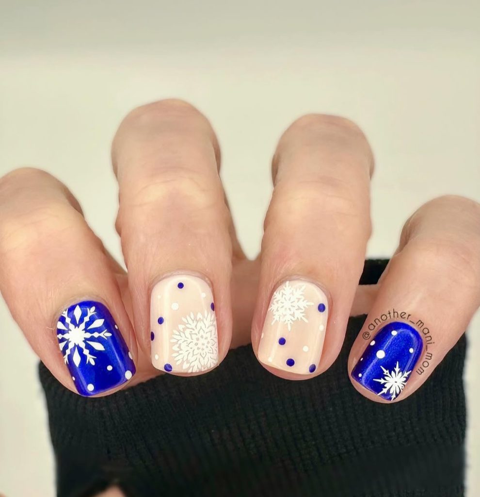 Alternating cobalt and natural nails dotted with little storms—graphic, playful, a touch retro. Who knew snow could feel this pop-art?