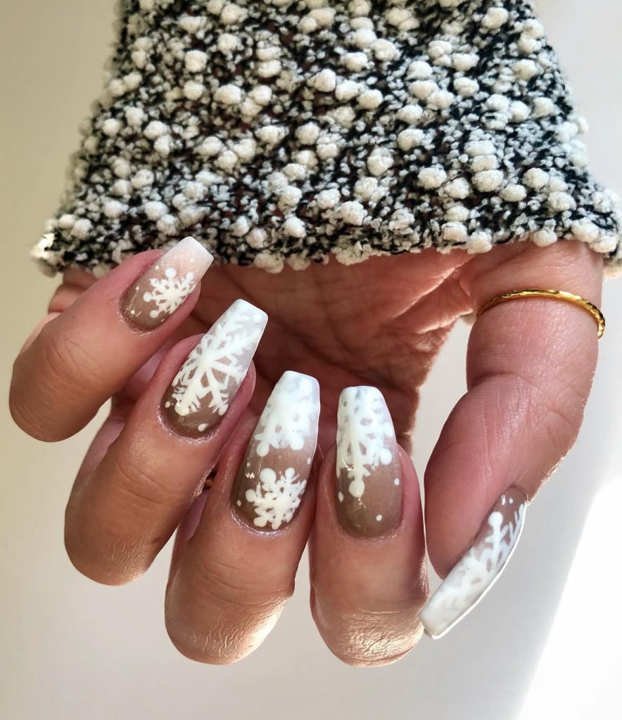 Milky tips drift into latte bases, then—boom—oversized flakes for drama. The soft sparkle at the edge turns them into glitter white snowflake nails… cozy but luxe.