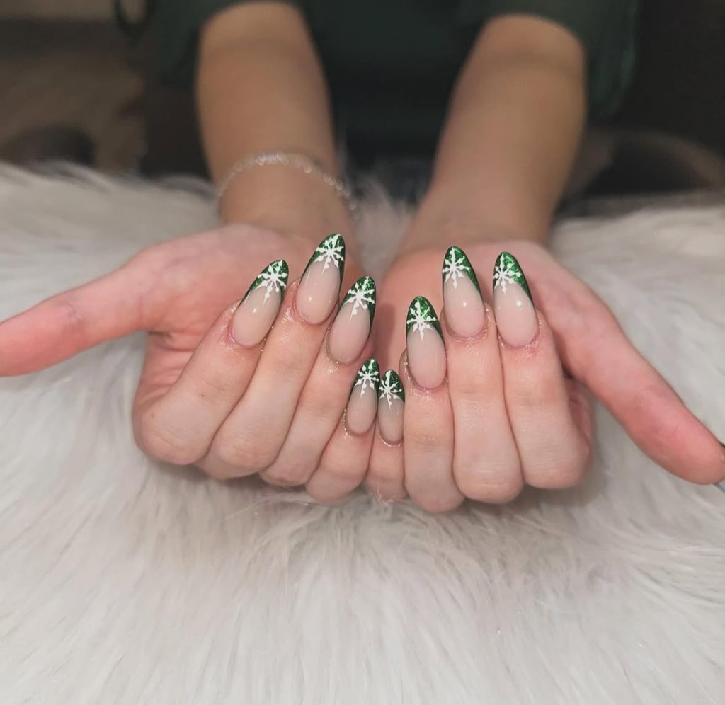 Glittering green crescents with delicate white bursts—simple, graphic, festive. Think “party at the tips” / “business at the base,” a clean take on snowflake design nails.