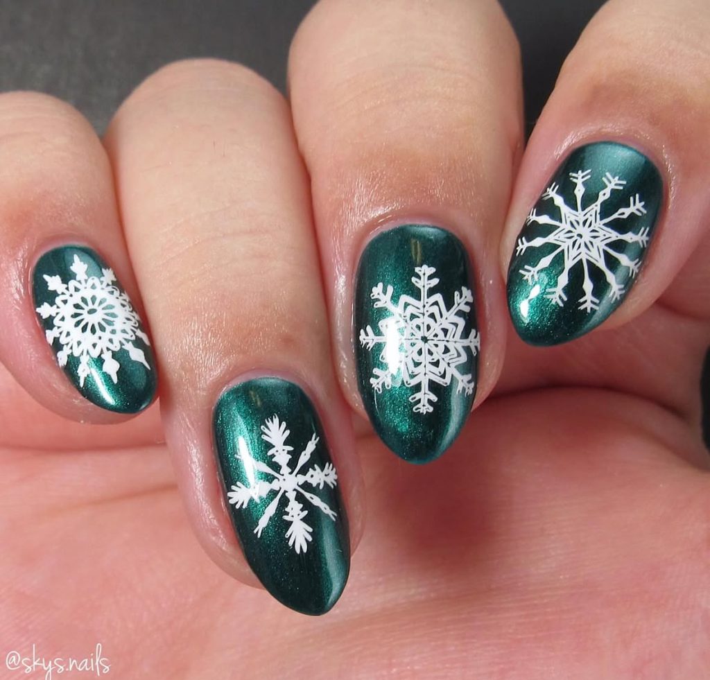 Jewel-toned green with sharp white crystals—like pine trees dusted after the first storm (magic, right?). Each flake is different, on purpose, because nature never repeats… why should your mani?