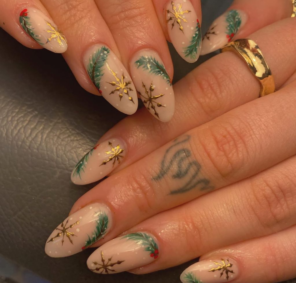 Transparent nude, hand-painted evergreen sprigs, and antique-gold flurries—hello vintage postcard energy. The tiny red berries are that last 10% that makes it feel like “story time,” not just nail art.