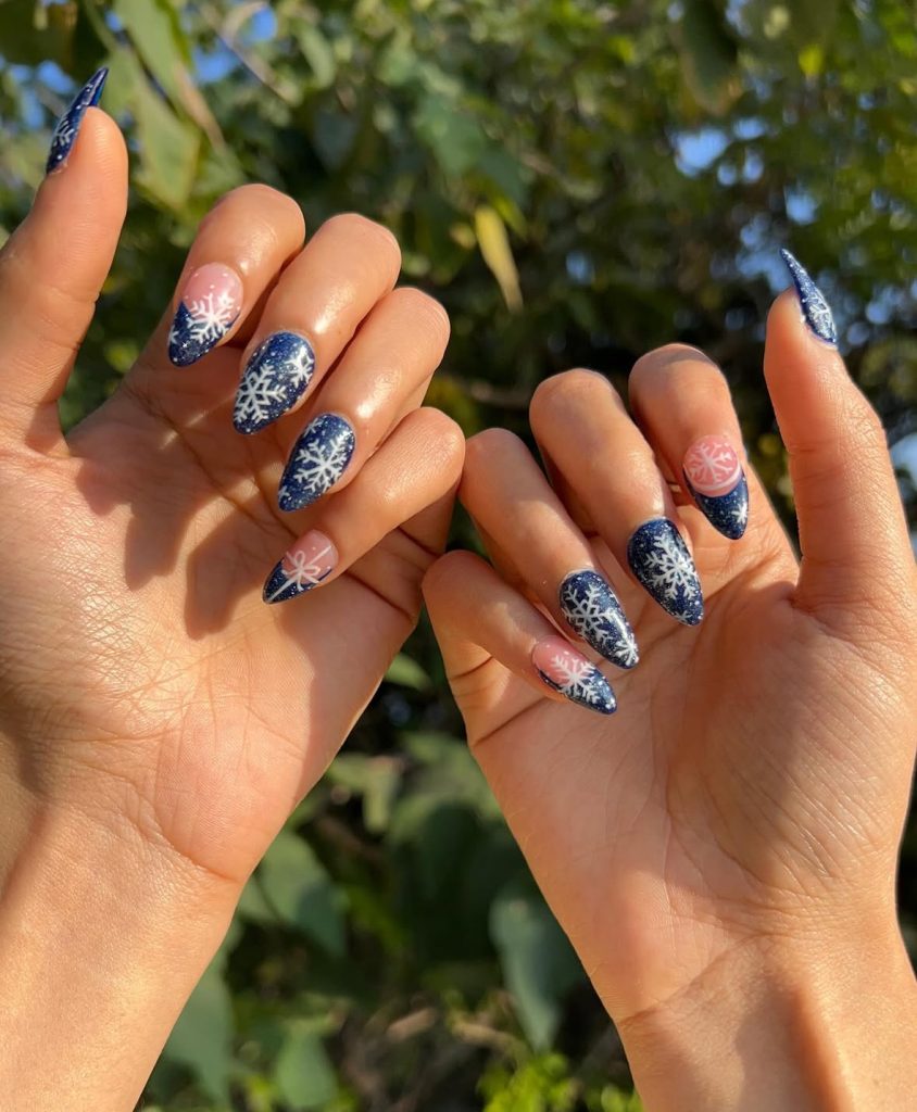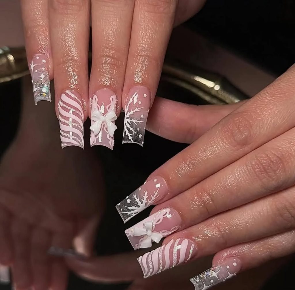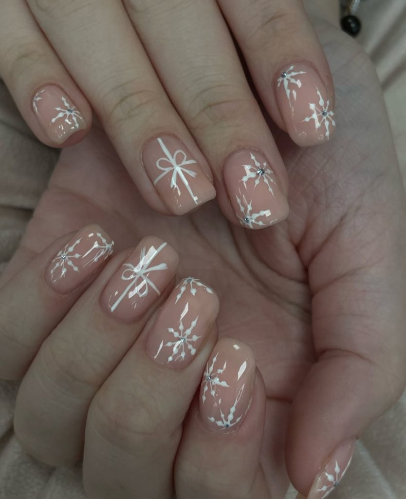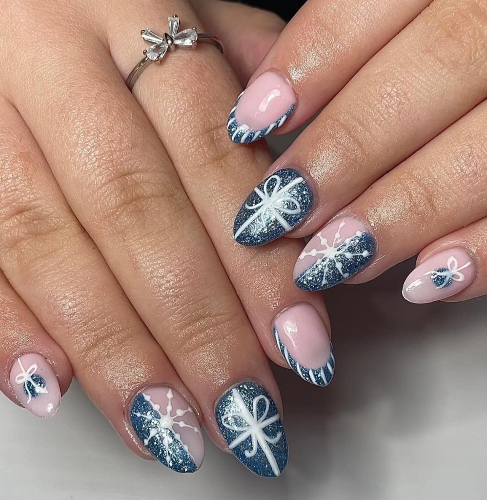 Navy sparkle bases tied up with crisp white “ribbons” and delicate flakes—like tiny presents you actually get to wear. The mix of glossy pink negatives keeps it airy/light. Consider it the cutest way to place a snowflake on nails without going full holiday costume… chic, right?
