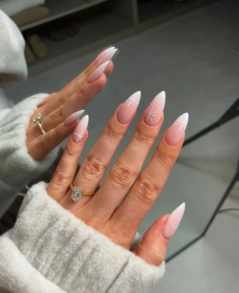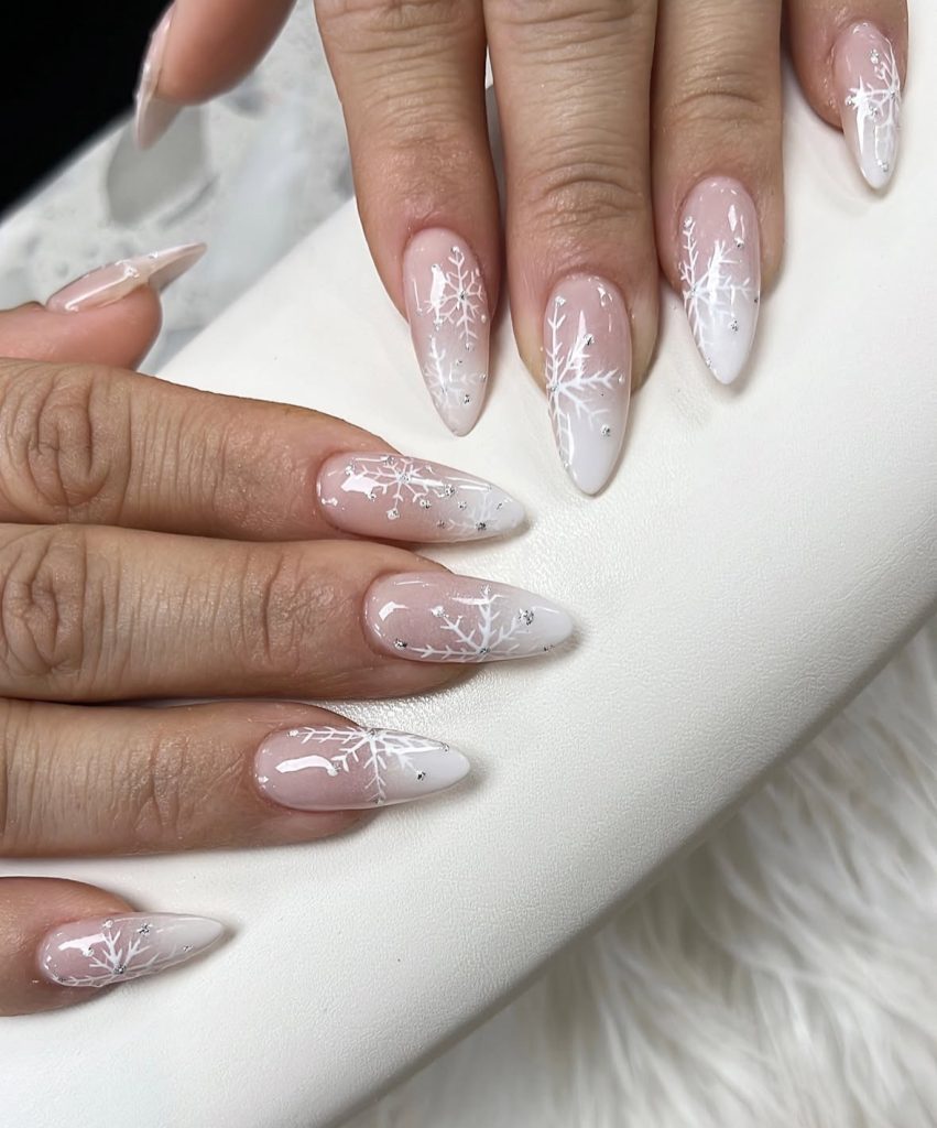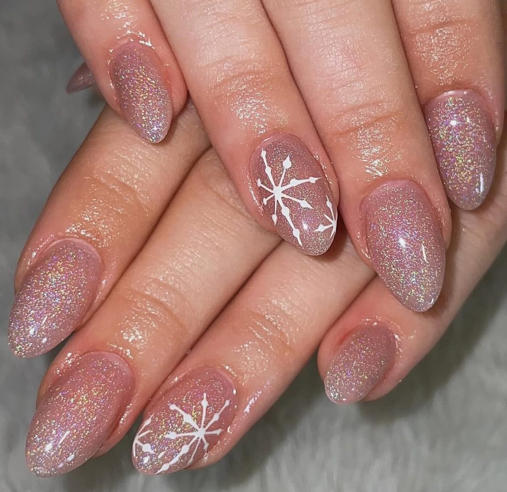 Feather-light pink-to-white fades with tiny flakes resting near the tips—SO soft. It’s the kind of set that whispers “snow day,” not shouts it, which is exactly the point.