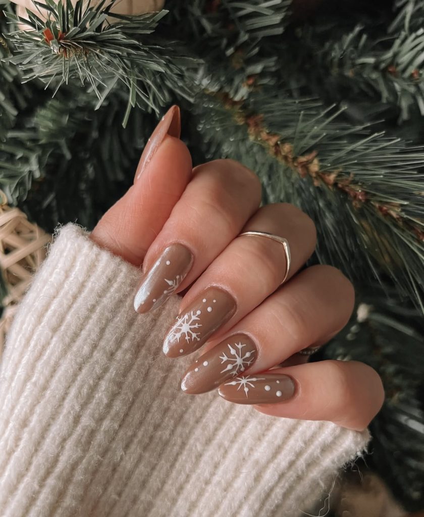 Creamy taupe + delicate flakes + dotted “flurries” = sweater-weather nails. Neutral enough for every outfit, festive enough for every party—what’s not to love?