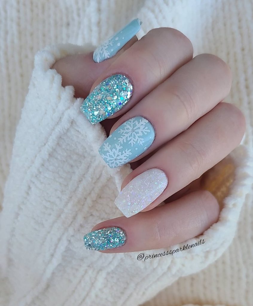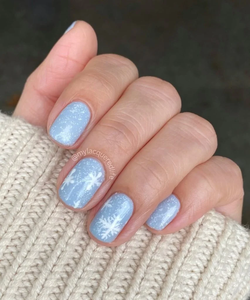 Pastel blues, chunky glitter, and crisp flakes stacked like layers of a snuggly sweater. The textures bounce off each other in the best way—sparkle vs. matte vs. shimmer. If you’re hunting for light blue snowflake nails, this set says “winter, but make it soft.”