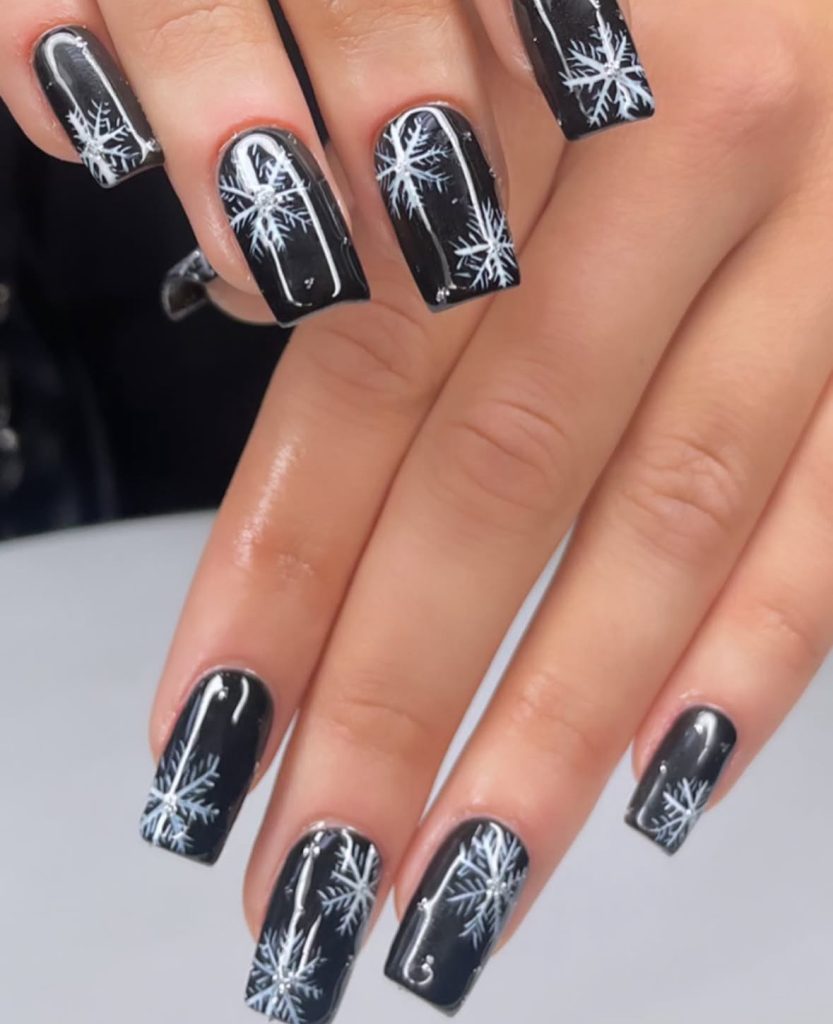 Glossy black rectangles with icy linework and bright flakes—high contrast, high drama. Add a few crystal dots and suddenly you’ve got snowflake nails that read black-tie ready. Why not let your nails do the talking?