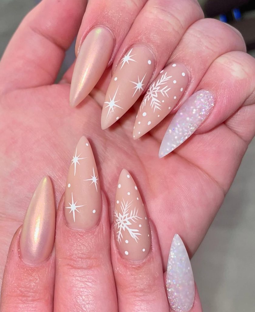 Soft champagne shimmer, tiny stars, and airy dots… like breath on a cold window. These are winter snowflake nails for the minimalists who still love a little magic (subtle, but not shy).