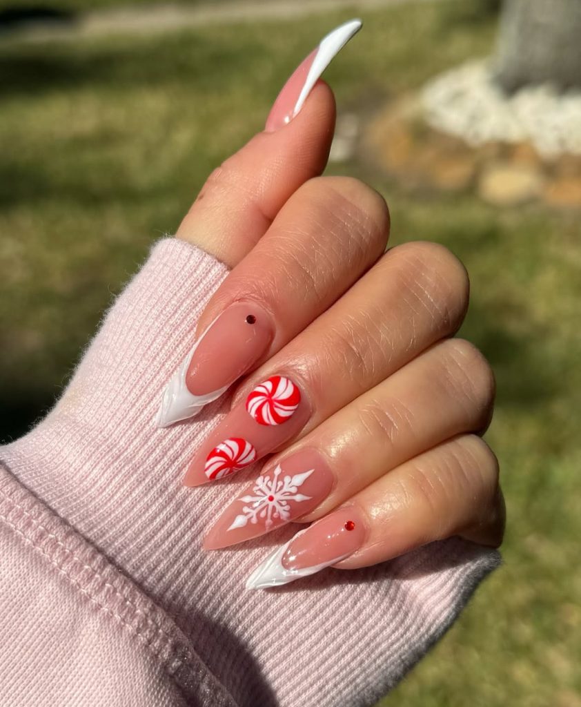 Sharp white tips, candy-swirl accents, and one icy flake—like dessert, but for your hands. If you’re craving french tip snowflake nails, this mix of sweet + sleek nails it, pun absolutely intended.