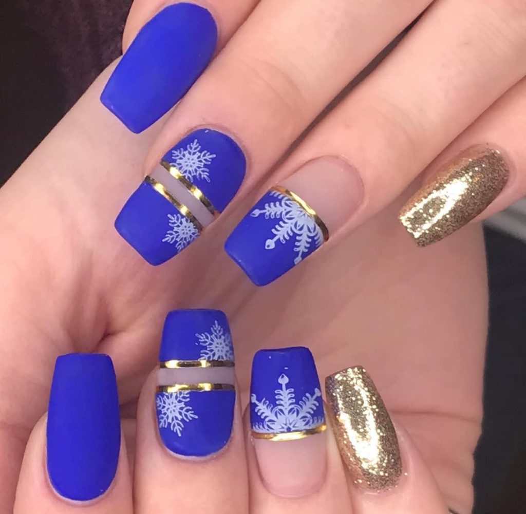 Matte electric blue + gold striping tape + crisp flakes = graphic winter drama. One glitter-bomb accent turns the volume up just enough (party hand achieved). Who said cozy season can’t be bold?!