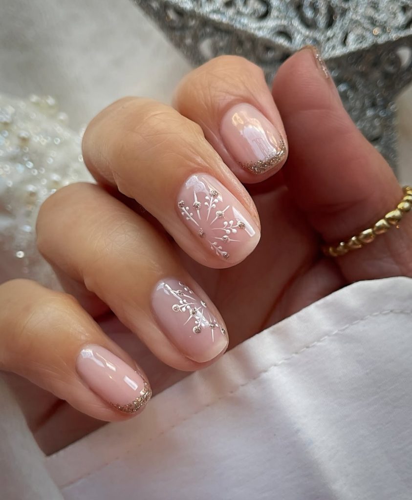 Short, glossy neutrals with silvery sprigs and micro-glitter edges. Understated sparkle that photographs like jewelry—see the twinkle?