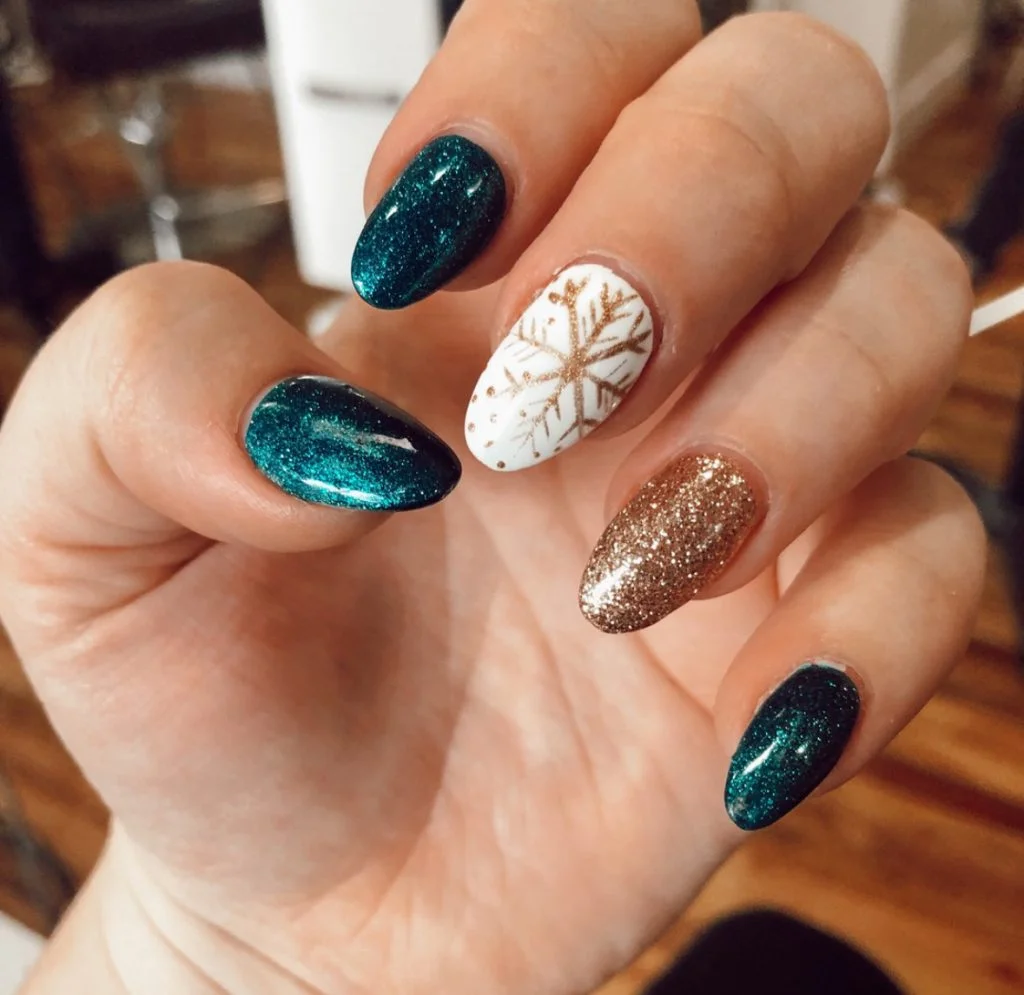 Jewel-toned teal shimmer meets a gilded snowflake on a crisp white canvas—contrast city. Then a full gold glitter nail for balance; it’s like jewelry you don’t have to take off.