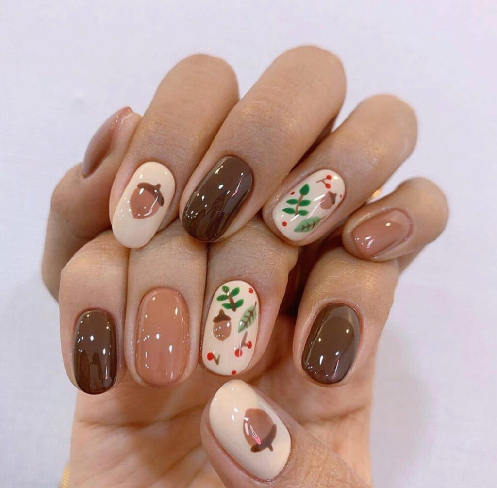 Neutral latte and chocolate solids pair with tiny acorns and berry sprigs—cozy sweater energy in a tidy, rounded shape. If you want something charming but work-appropriate, pin this under your Thanksgiving nail ideas folder.
