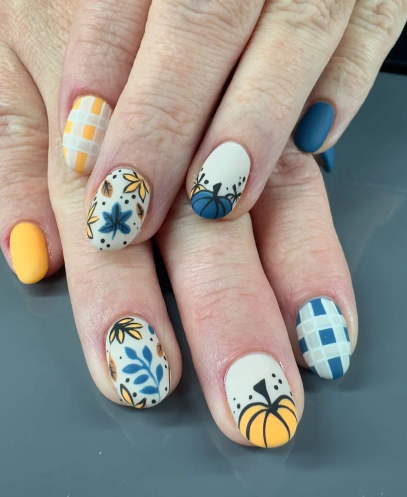 Matte navy and marigold take turns—plaid on one nail, tiny leaves on another, then a tidy pumpkin peeking up like it grew overnight. It’s the manicure equivalent of a cozy flannel layered over your favorite tee, cheerful but still chic. Short, practical, and ready to pass the rolls without smudges.