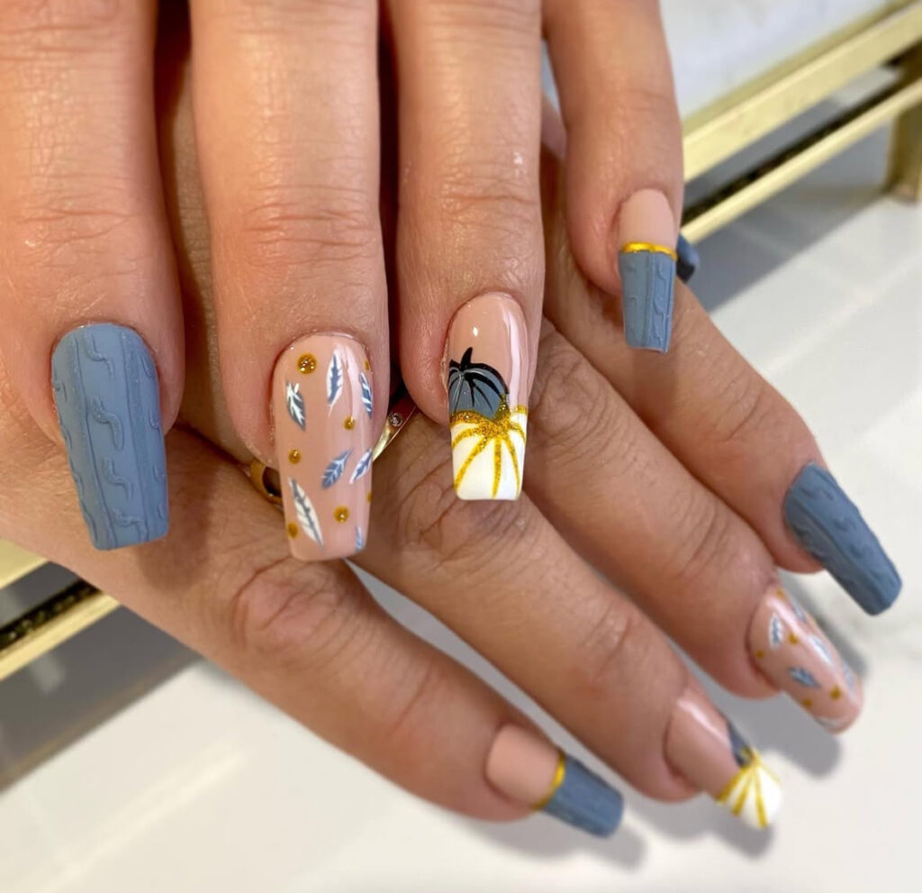 Matte cable-knit texture in stormy blue plays against nude panels sprinkled with airy feathers and little gold dots. Add the pumpkin accent capped with a glittery belt, and suddenly your manicure is the coziest thing in the room.