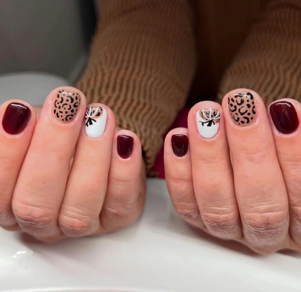 Short, rounded wine-red nails meet tiny bows and leopard spots for that sassy-meets-sweet balance we all secretly love. They’re comfortable for cooking and still glam for clinking glasses.