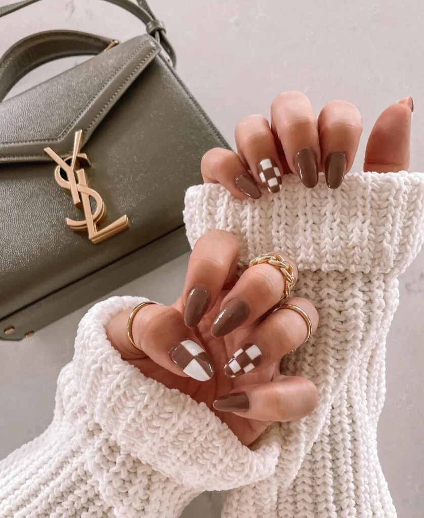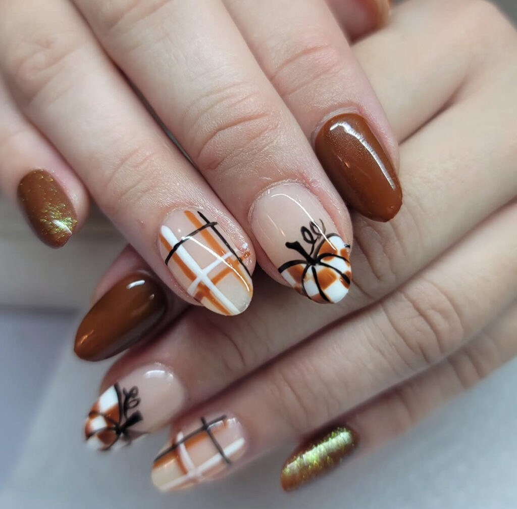 Warm latte and cinnamon browns get grid-lined like a fall scarf, then outlined pumpkins steal the spotlight with a single swoop of black. A touch of metallic shimmer on the side nails makes it dinner-table fancy without trying. If your vibe is “host who actually enjoys hosting,” this is it.