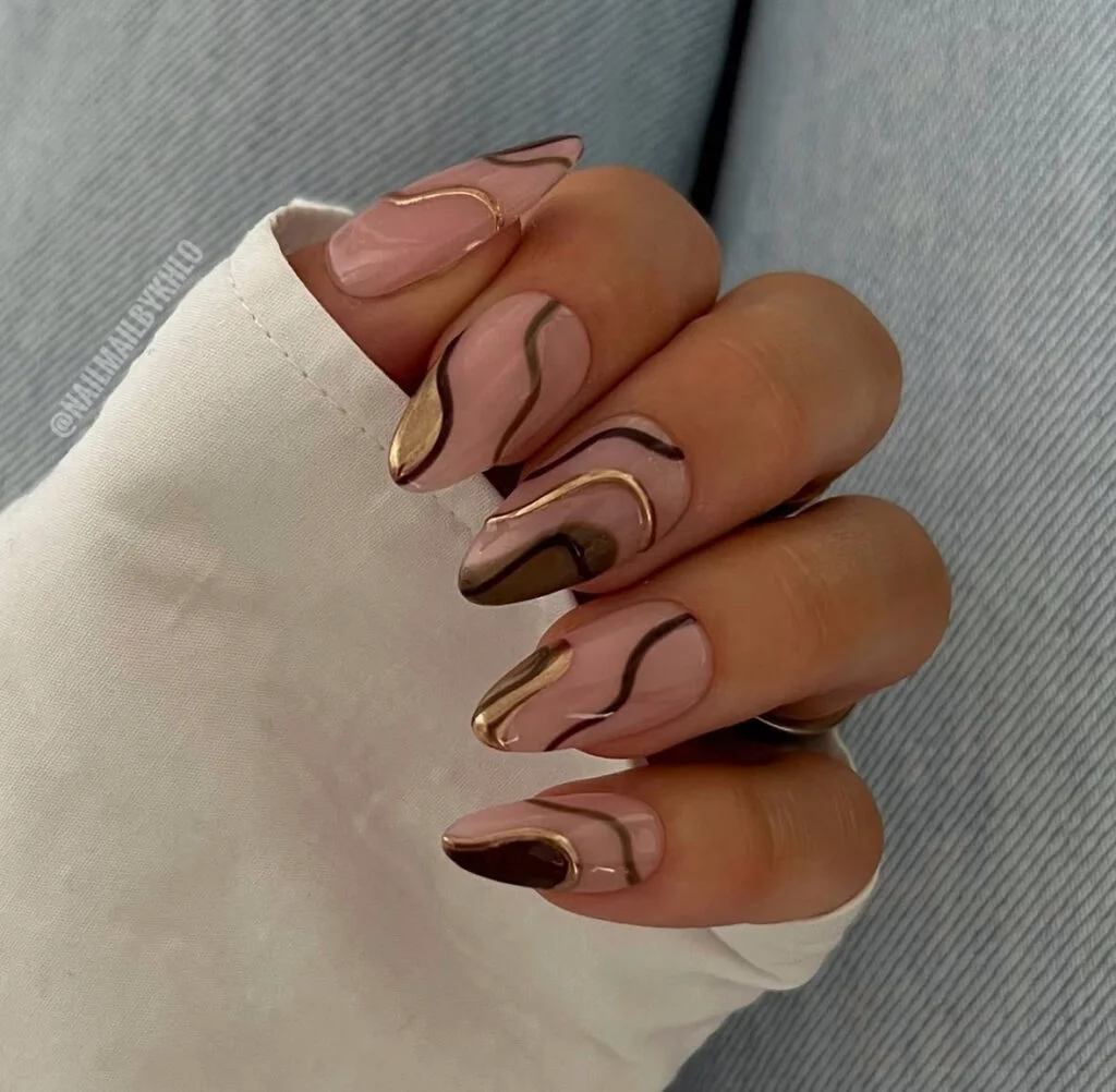On a rosy nude base, espresso and molten-gold waves slink across like fancy icing on a bakery cake you definitely didn’t bake (no shame, store-bought wins). Sleek, warm, and grown-up—decadent brown Thanksgiving nails that still play nice with everything in your closet.