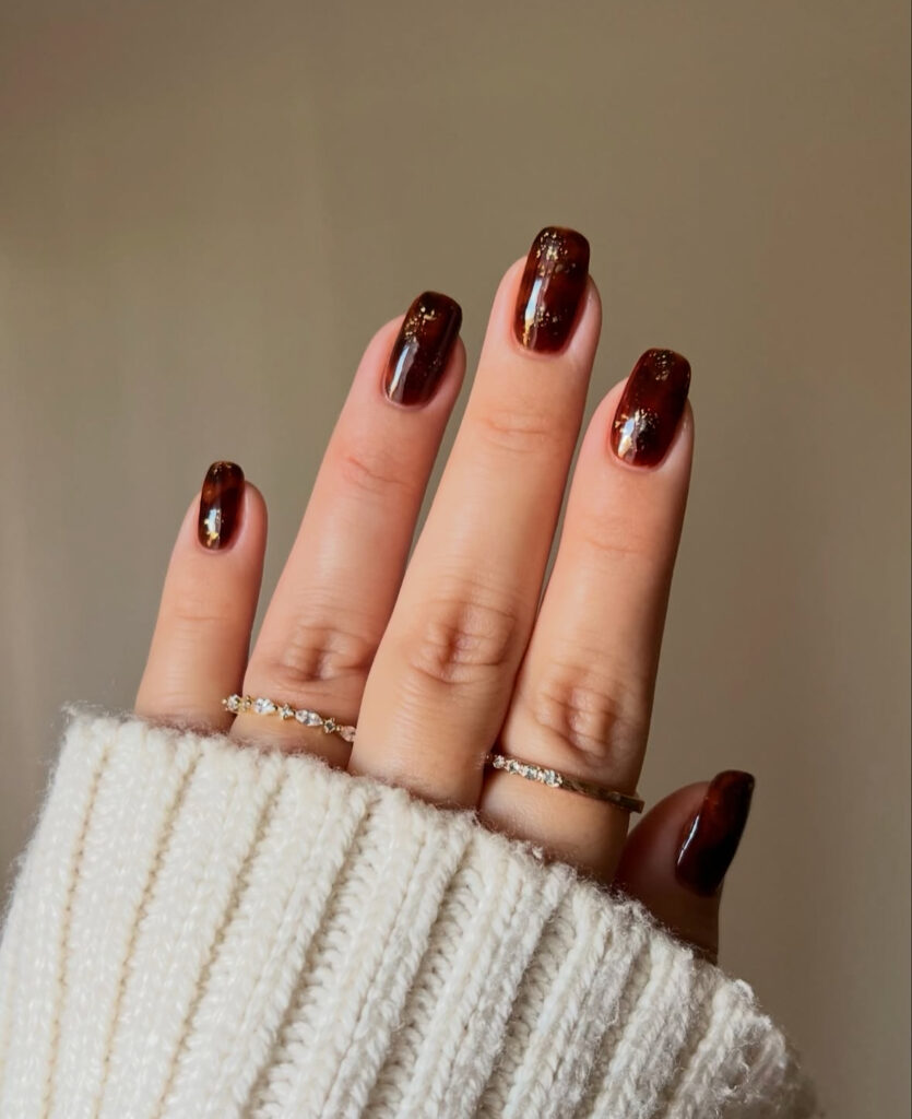 A sheer chestnut fades toward inky cocoa, and tiny gold flecks float around like twinkle lights over dessert. It’s glossy, cozy, and reads quietly luxe—picture-perfect Thanksgiving ombre nails for sweater weather hands.