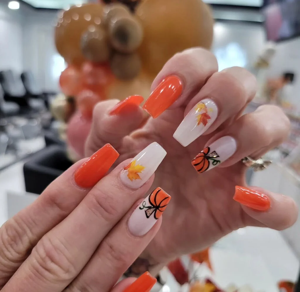 Juicy creamsicle gradients meet crisp white panels stamped with pumpkins and fluttery maple leaves—like your front porch décor, but wearable. Bright, cheerful, and absolutely doable at the salon or at home.