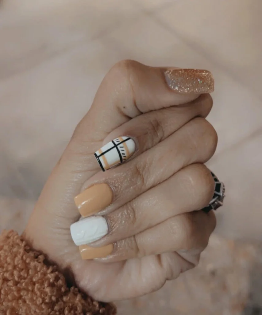 This one feels like you pulled your favorite sweater straight onto your nails—warm caramel, creamy white, a crisp plaid accent, and that sugar-sparkle thumb that basically winks “save me a second slice.” Short and practical (because dishes, cousins, chaos), yet totally polished—perfect short Thanksgiving nails without trying too hard.