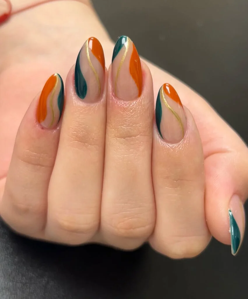 Teal forests meet roasted-pumpkin orange in silky ribbons with a whisper of gold that catches the light just right (yes, people will ask). Soft almond tips keep it elegant, landing squarely in the sweet spot of fall/Thanksgiving nails.