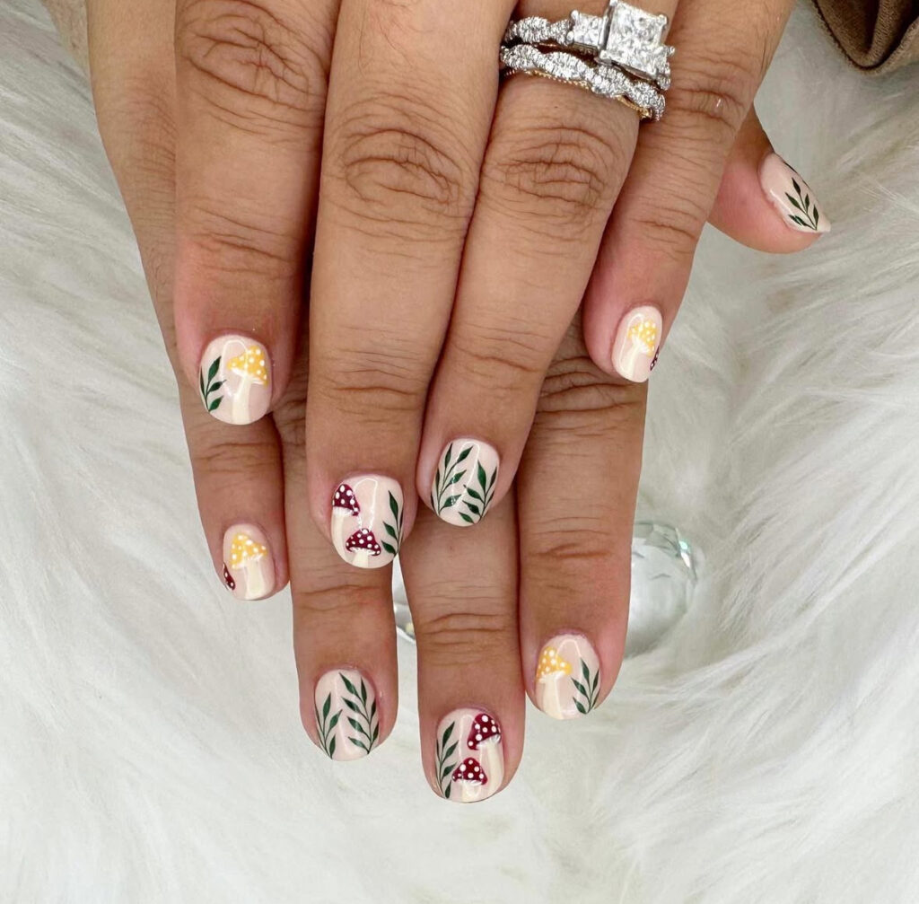 Creamy nude base, dainty green sprigs, and cheerful mushrooms marching across short, practical nails—cute enough for photos, sturdy enough for dish duty. Nature-y and sweet, they’re peak fall Thanksgiving nails without the fuss.