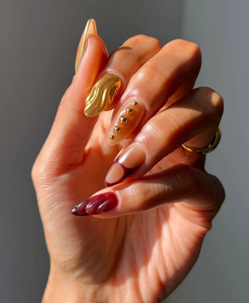 Chrome-gold ripples, negative-space burgundy tips, and a neat row of tiny studs—basically candlelight in manicure form. If you’re going sleek and dressy this year, these Thanksgiving nails do the heavy lifting while you just show up with pie.