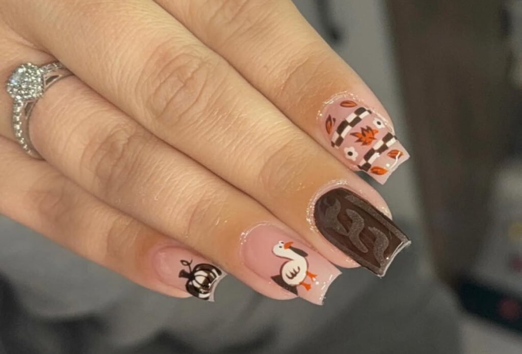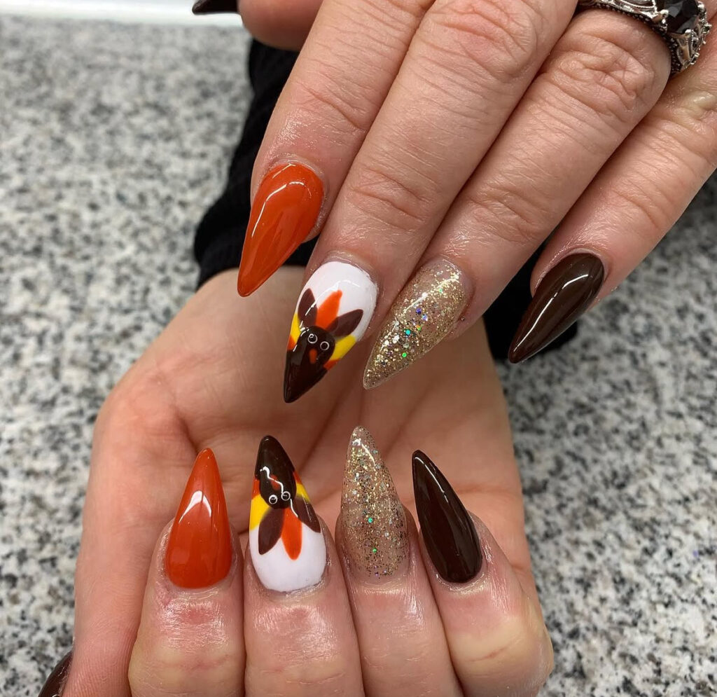 Classic pumpkin orange and fudge brown get a glitter spike, then—surprise—a cartoon turkey pops in like the cousin who always makes you laugh. Festive without going full costume, these are perfect Thanksgiving theme nails for the spirited guest.