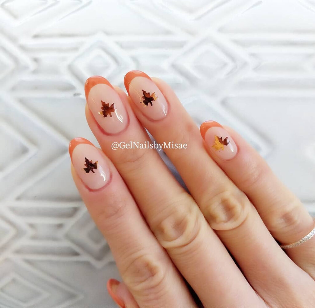 Soft nude with tangerine tips and a single metallic maple leaf centered on each nail—like press-on confetti, but grown-up. Simple, quick, and photogenic when you’re balancing a slice of pie in the other hand.
