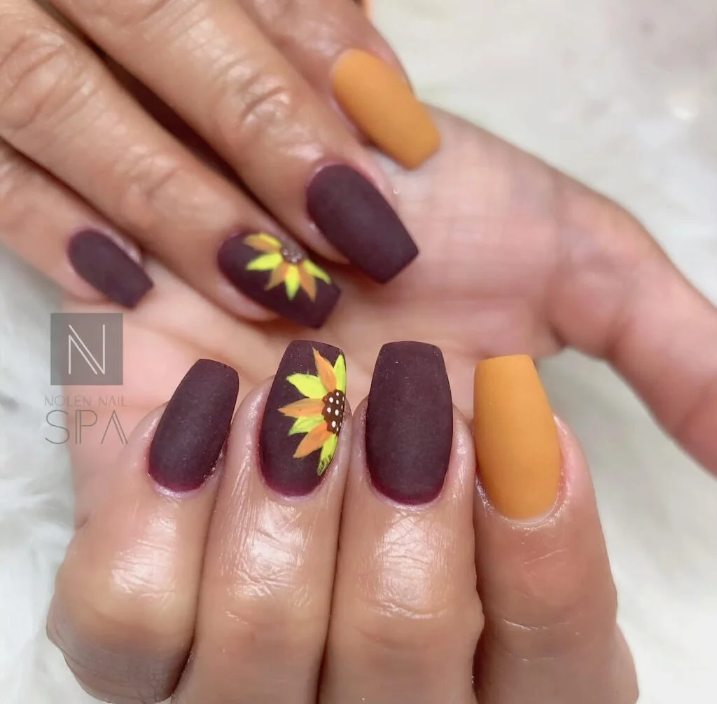 Velvety dark-plum squares with hand-painted sunflowers that look like they wandered in from the centerpiece. A single mustard accent nail ties it all together—warm, cheerful, and ready for the group photo.