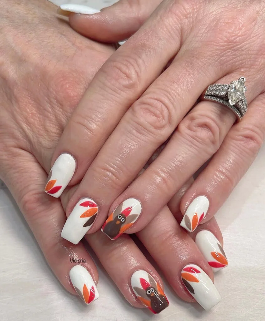 Crisp white squares, graphic leaf “feathers,” and two tiny gobblers peeking out just enough to get a smile from the table. Clean lines keep it modern, so your mani matches the linen napkins and not the kid’s craft paper.