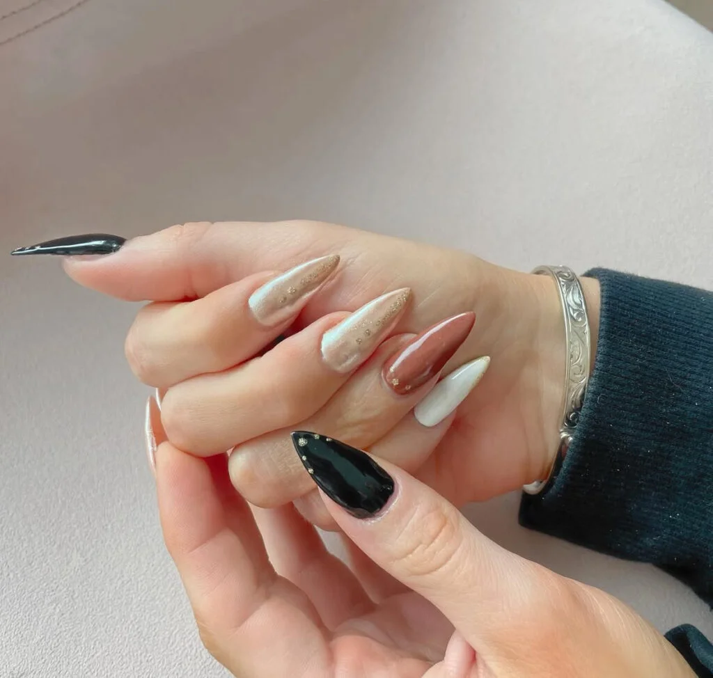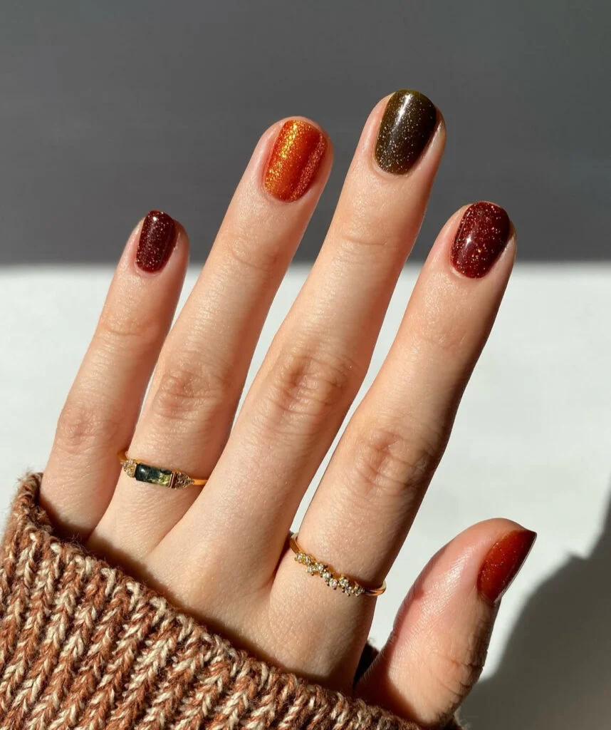 Each finger grabs a different glittery shade—ember orange, cider copper, mossy green, mulled-wine brown—like a flight of fall drinks for your hands (responsible, zero hangover). If you love variety, these Thanksgiving colored nails let you wear the whole palette at once.
