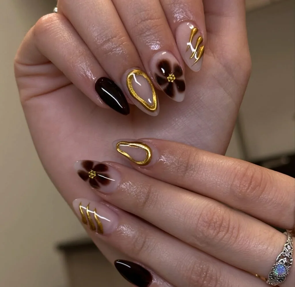 Luxe without being loud—espresso-petal blooms on a sheer base, plus those drippy gold chrome “puddles” that look like jewelry you forgot to take off (intentional, of course). A glossy black moment keeps it grounded and glam—bookmark for Thanksgiving nails 2025 when you want compliments before the appetizers even land.