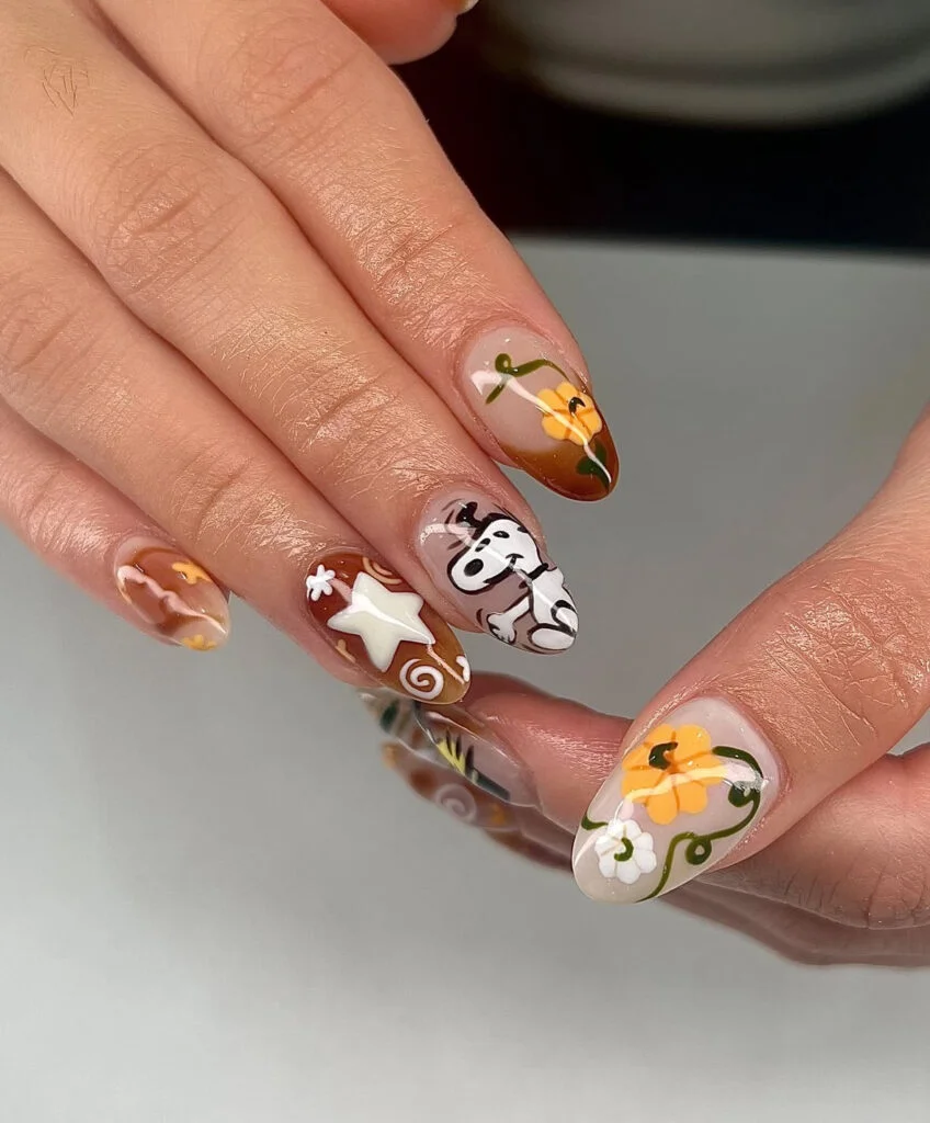 Butterscotch swirls, pumpkin blossoms, and a sugar-cookie star—then a cheeky little cow-print moment right in the middle like the cousin who photobombs every picture. Playful and artsy without tipping into chaos, these almond tips make even the mashed-potato mixer feel like a prop.