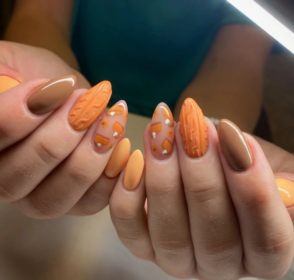 Glossy pumpkin and caramel nudes meet matte, 3-D cable-knit accents (yes, the cozy sweater pattern right on your nails), plus a confetti-jelly moment for fun. If you love tactile details, these feel like weekend vibes in manicure form—spot-on acrylic Thanksgiving nails.