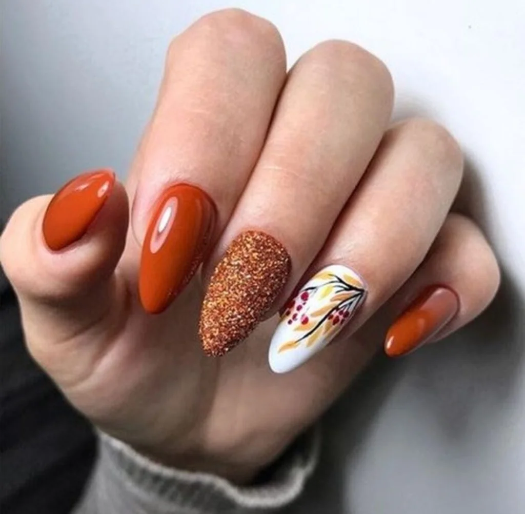 Burnt-orange solids, one nail dipped in full sugar sparkle, and a crisp white accent painted with a delicate berry branch—festive without shouting. This is the “I have sides in the oven and still look put together” vibe, truly easy nails for Thanksgiving.