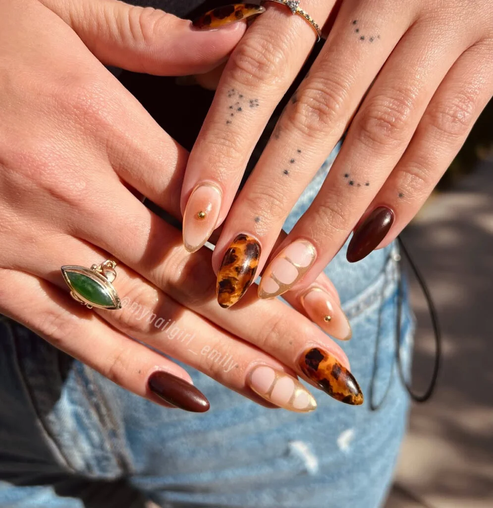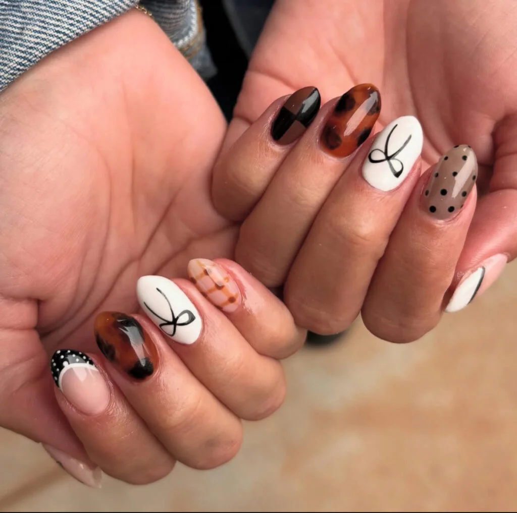 A little bit tortie, a little bit plaid, a little bow tie, and a tiny polka-dot French—like mixing patterns in your outfit but on ten tiny canvases. It reads clever and playful, prime cute Thanksgiving manicure for the person who brings the charcuterie board and the conversation.