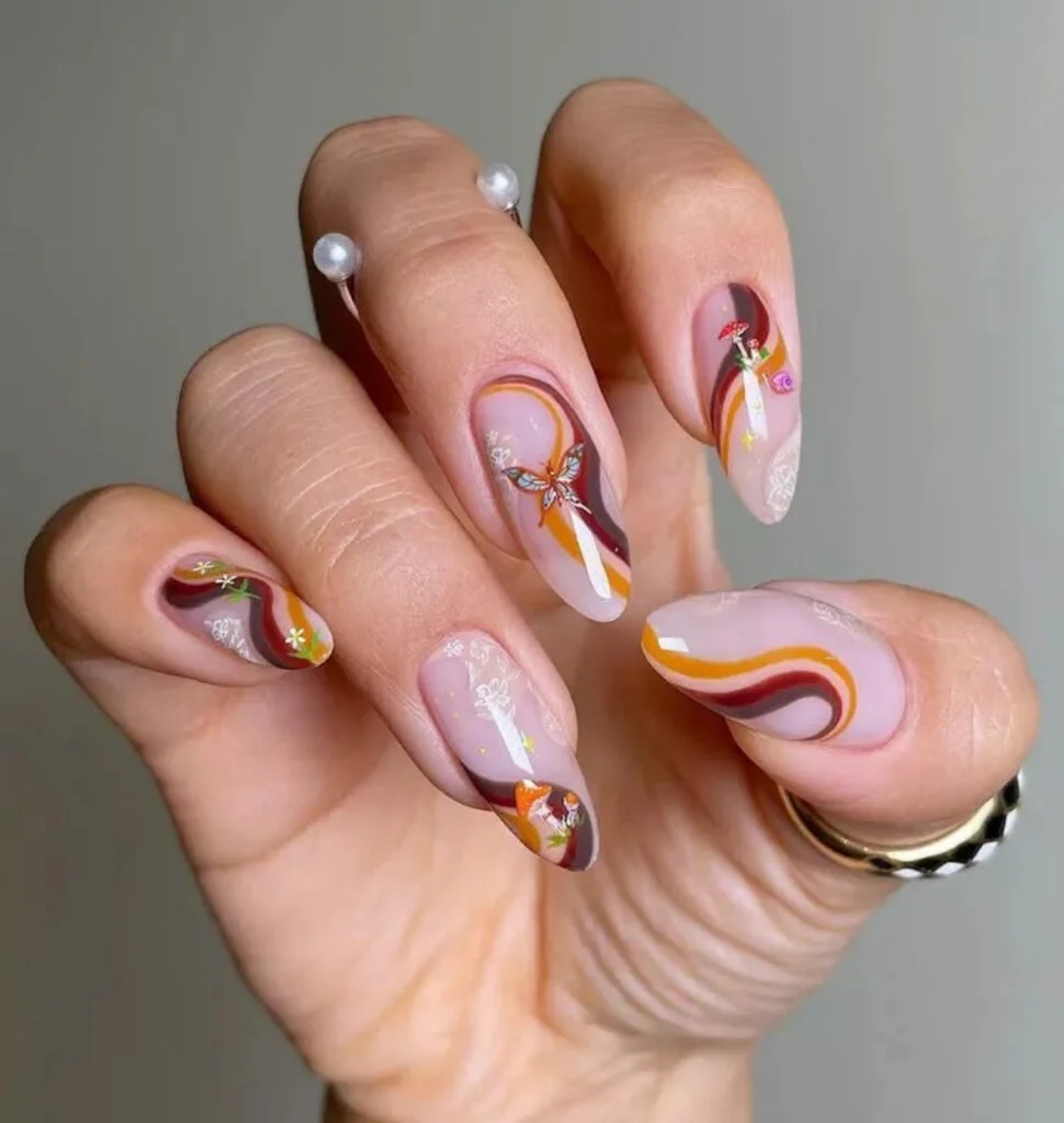 Curvy ribbons of cocoa, pumpkin, and marigold swirl across a sheer base, then—surprise—tiny butterflies and mushrooms sprinkled in like the cutest forest cameo. It’s artsy without being precious, the kind of Thanksgiving almond nails that spark compliments from both nieces and aunties.
